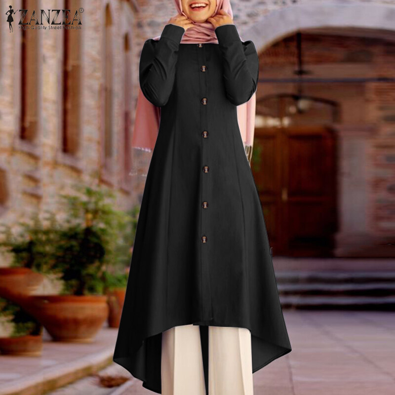 ZANZEA Women Muslim Dubai Evening Long Tops Button Down Solid Tunic Shirt Blouse