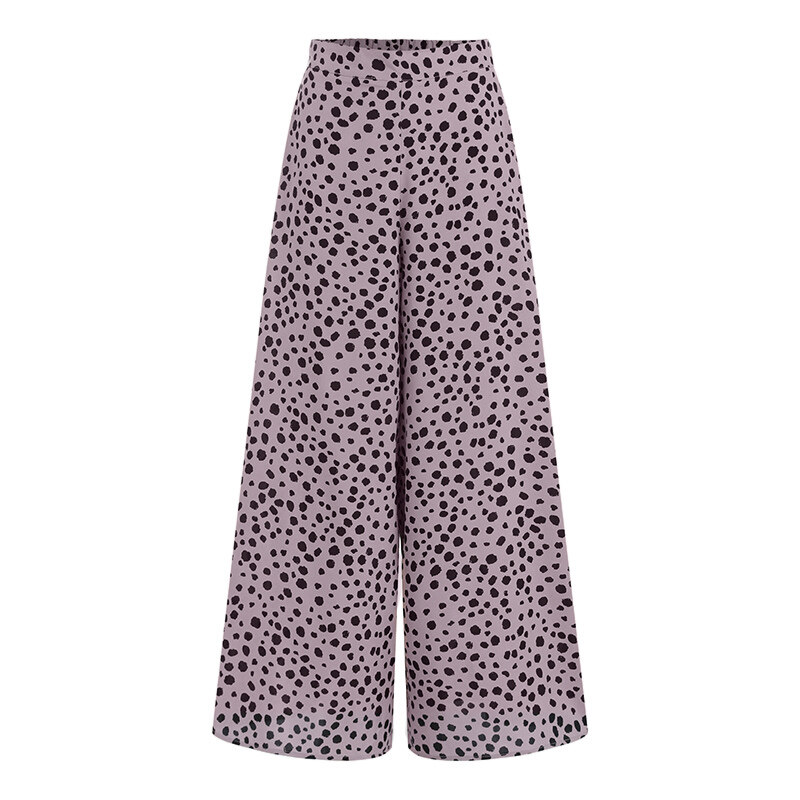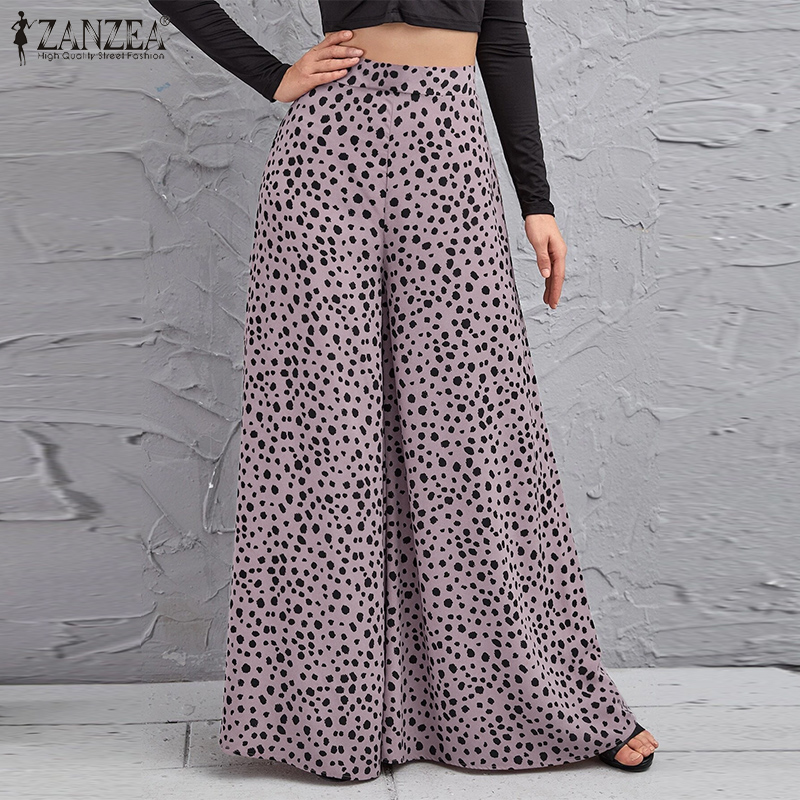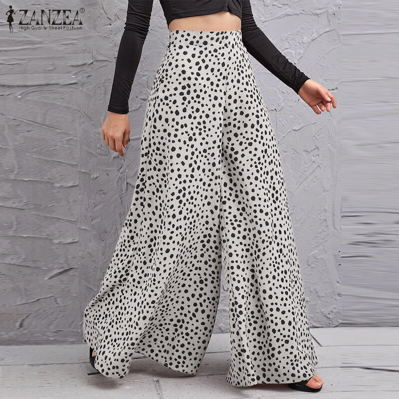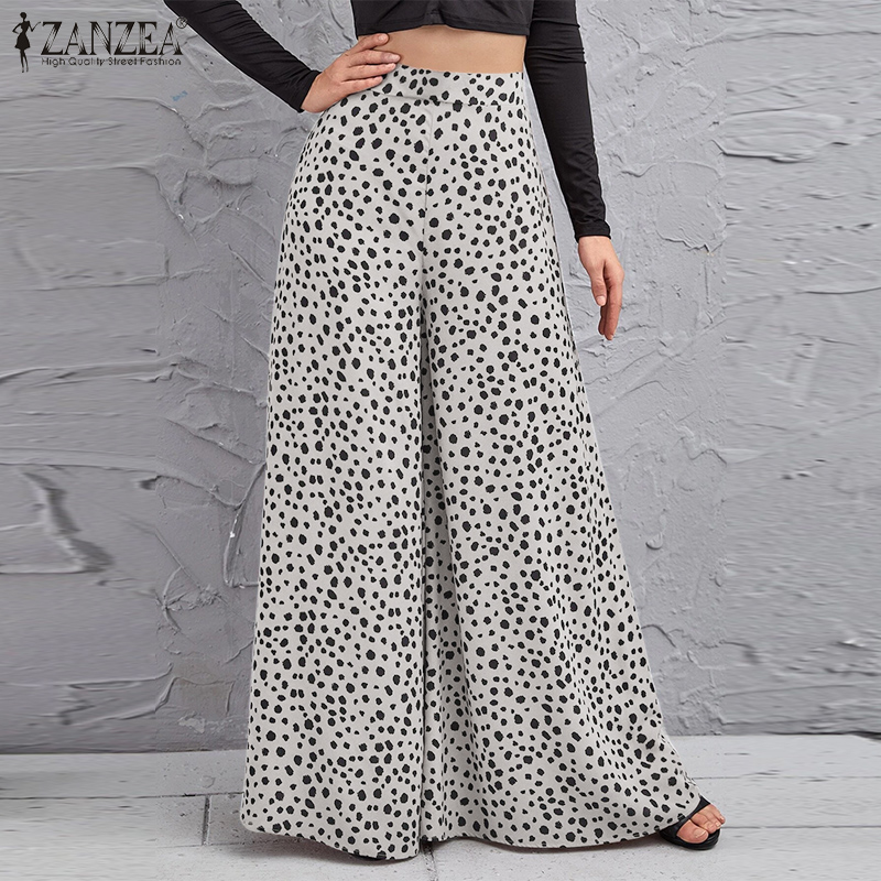 ZANZEA Women Fashion Elastic Waist Wide Leg Holiday Trousers Polka Dots Long Pants