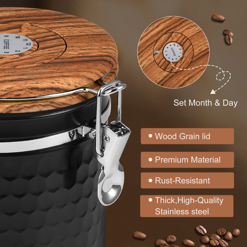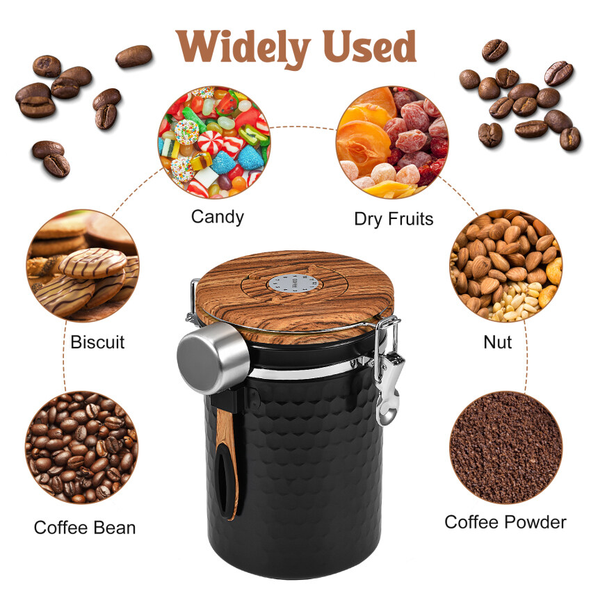 4.Universal: airtight coffee canister/storage jar made of stainless steel for storage and protection of cereals, spices, coffee, tea, flour, cereal, nuts, rice, salt, sugar, sweets, tea, dried fruits, wheat, rice, pastries, spaghetti, tea and animal food.